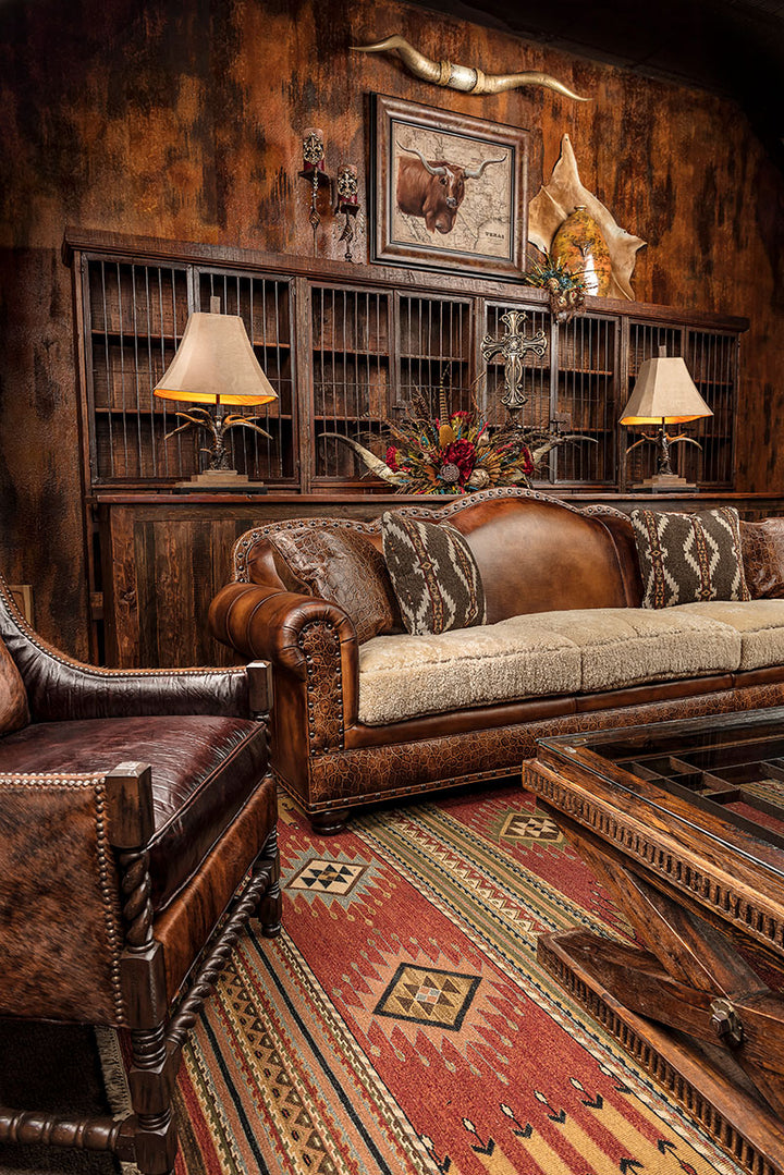 - A rustic sofa or sectional with longhorn-carved wooden frame, crocodile embossed yokes, and brindle cowhide.