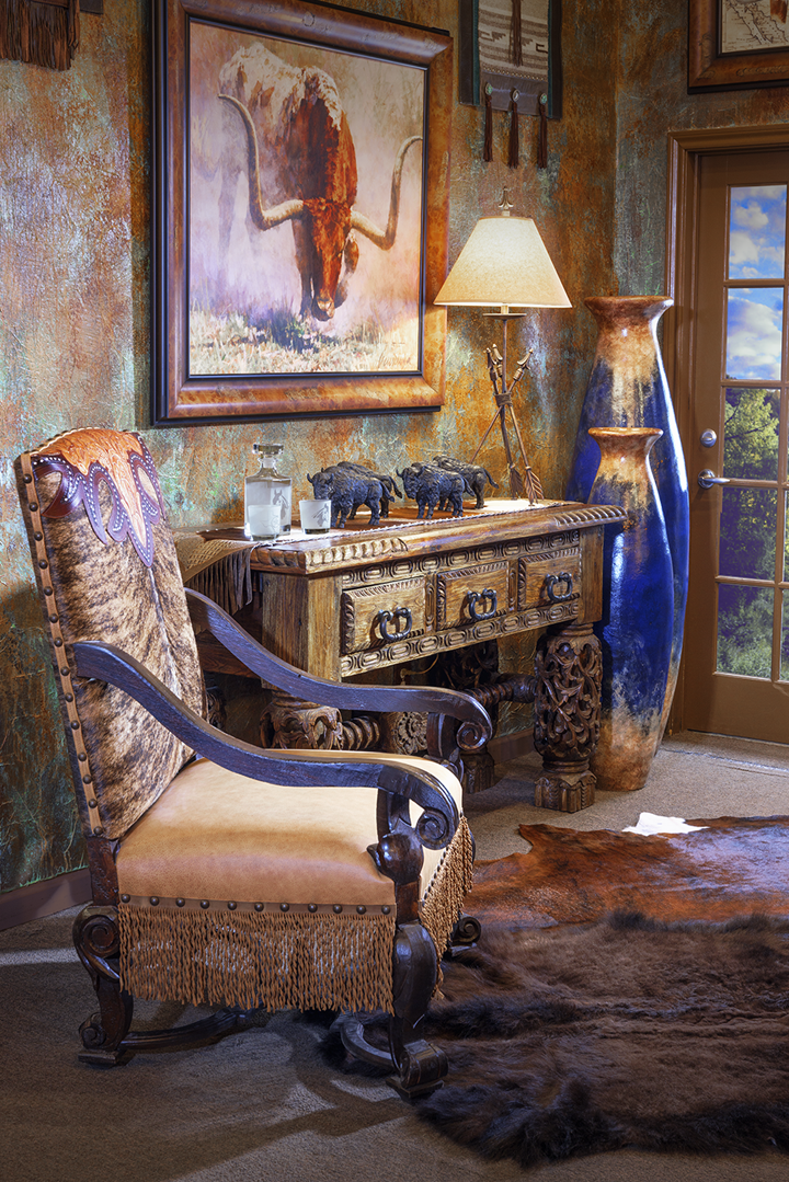 - Center the space with a robust wooden desk featuring a distressed finish and cowhide or axis hide panels, and complete it with a small western desk lamp.