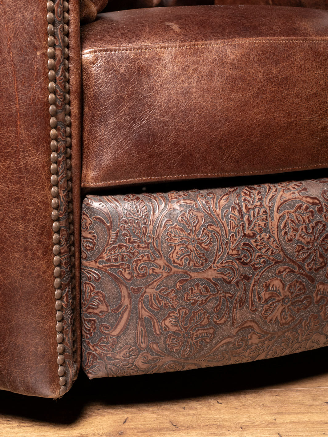 This rich, Western-style leather features an intricate floral and scroll pattern deeply embossed into a warm Indios brown base. The detailed tooling mimics hand-carved leatherwork, adding a classic ranch-inspired look perfect for accent furniture, bar stools, and saddle pieces. Durable and artfully finished, this leather combines rugged charm with upscale elegance.