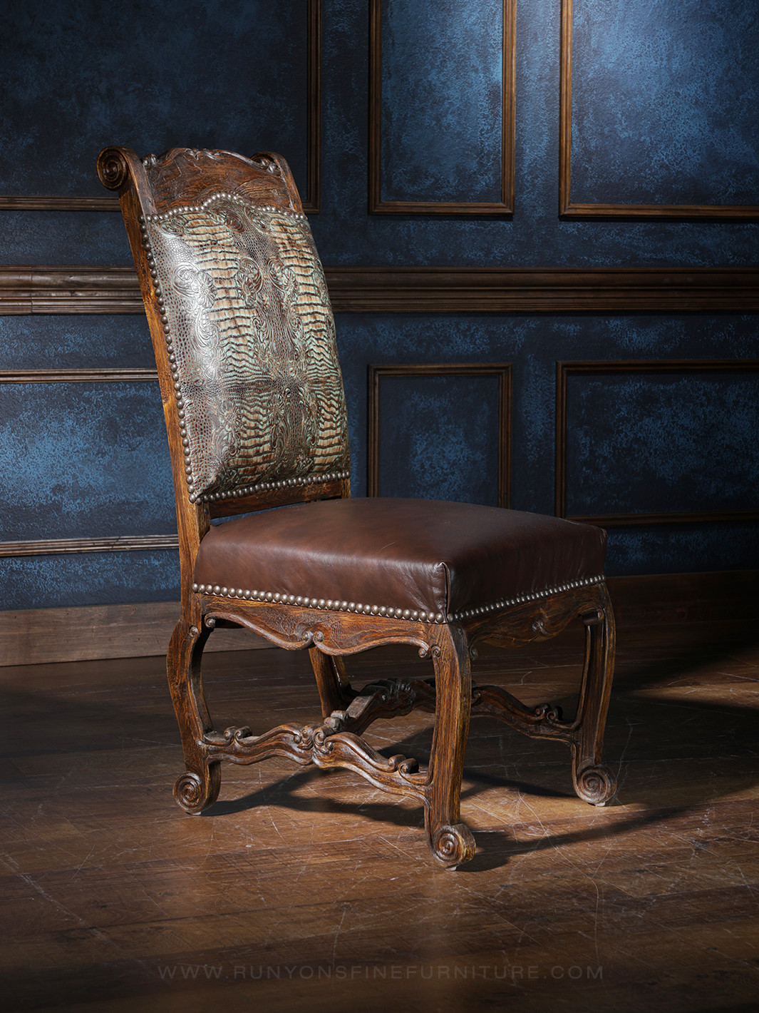 Every piece is handcrafted with a unique, antique-style character with ornate designs and carvings. The chairs feature genuine leather, adding a touch of luxury and comfort to the intricate craftsmanship. Each item can be custom-made to order so it can match your tables and other western furniture in your home for a stylish living space.