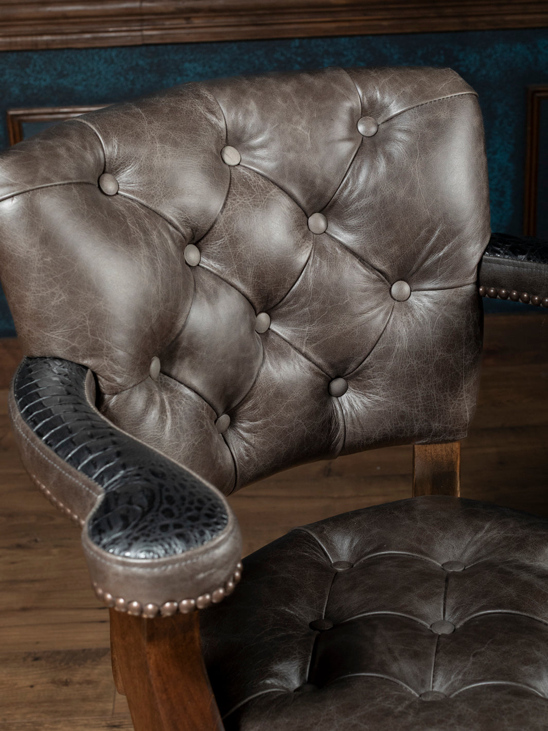 Tufted Greystone Leather Bar Stool in grey full grain leather with embossed black crocodile accents in a western bar space.