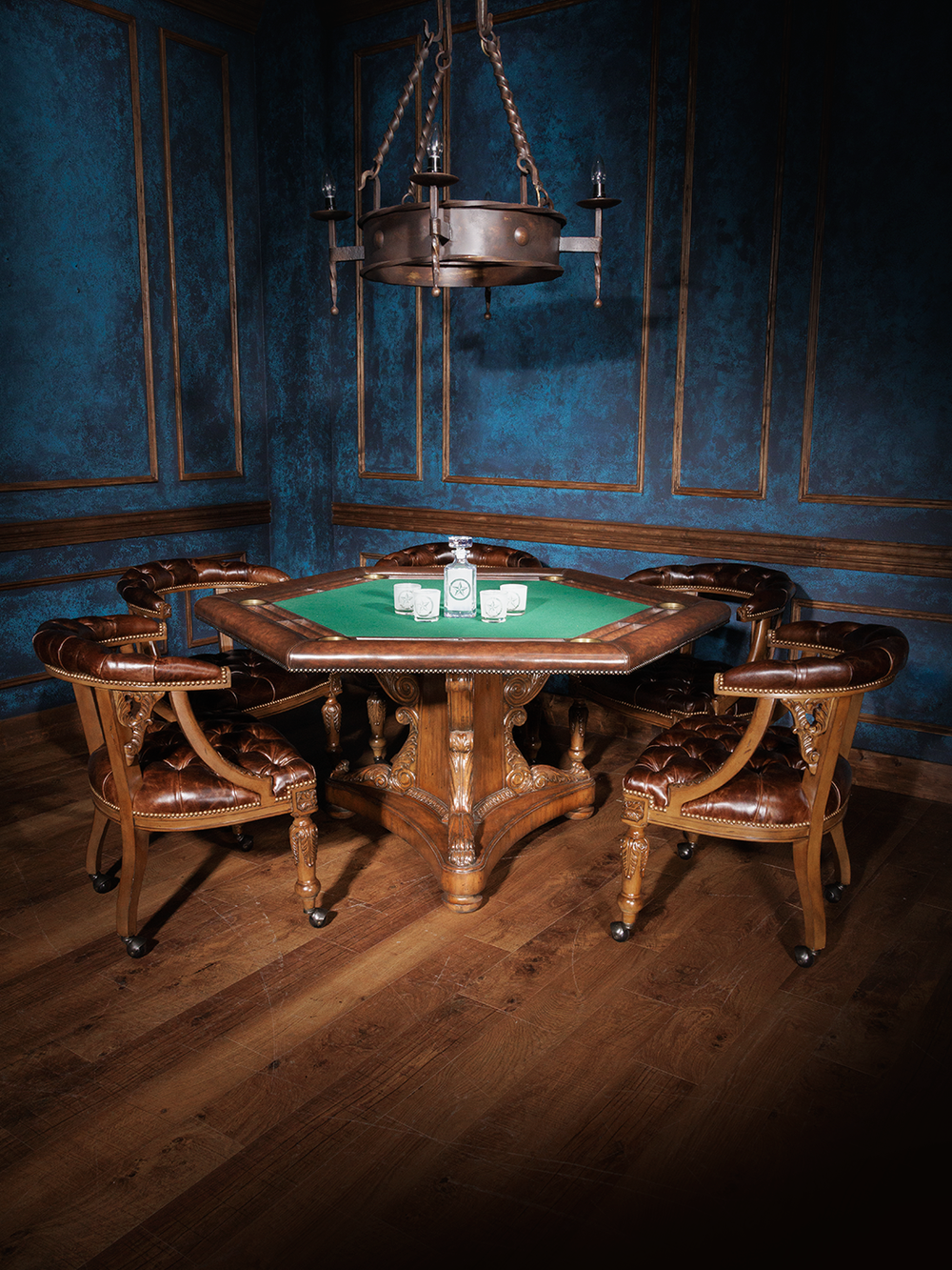 Featuring a hexagonal shape, dark antique lido finish, green felt top, and antique brown leather edges, our Big Slick Poker Table is sure to impress your entertainment area.