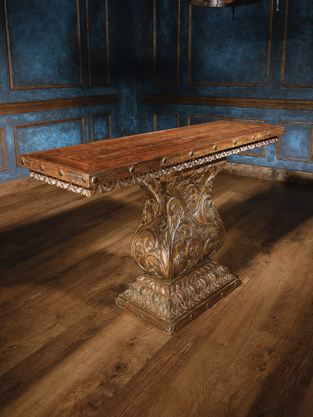 Add a touch of rustic character to your home with our reclaimed wood console table constructed from salvaged teak. Each handmade piece showcases original nail holes, cracks, and other time-worn attributes, and is hand-finished with a neutral stain to highlight the wood's natural color and grain.