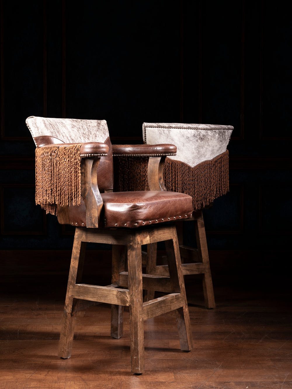 The Dark Rum Fringe Leather Yoke Bar Stool showcases top-tier craftsmanship, built to the highest standards of quality with exceptional attention to detail. The padded seat and arms with thick foam cushion are upholstered in full-grain Cambridge brown leather, while the inside and outer back feature a combination of the same leather and gray upholstery-grade brindle cowhide. Leather fringe accents on the arms add to its rustic charm, adding to its western heritage and rustic charm.