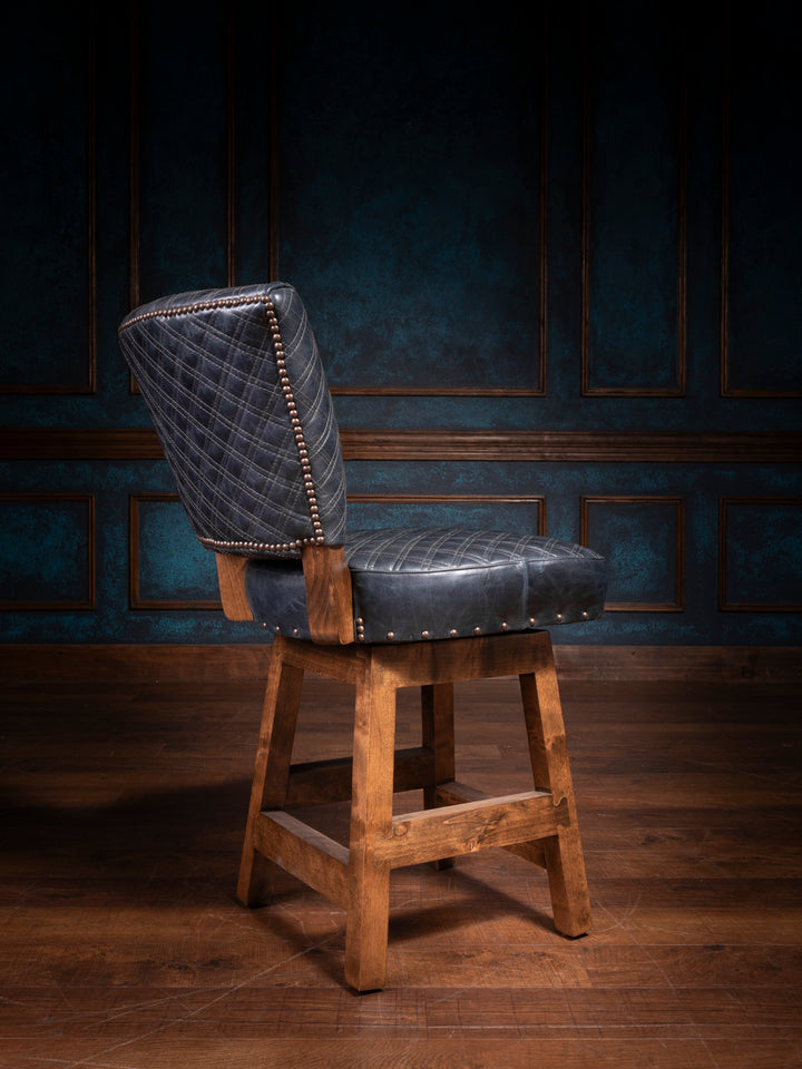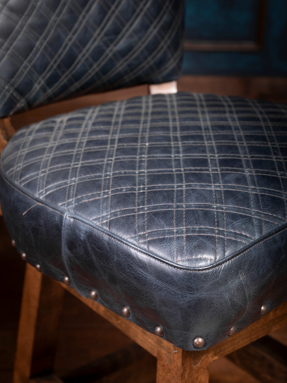 The Lavish Navy Leather Bar Stool is beautifully upholstered with premium aniline leather featuring a waxy crackled effect and medium gloss finish. A stunning diamond stitch design covers the seat, backrest, and outer back, adding distinguished style and supreme comfort. The deep seat cushion is trimmed in antique bronze nail heads, while the hand-aged wipe-off leather brings a bold touch of authentic western style. This upscale western bar stool stands out as a stunning piece of functional art.