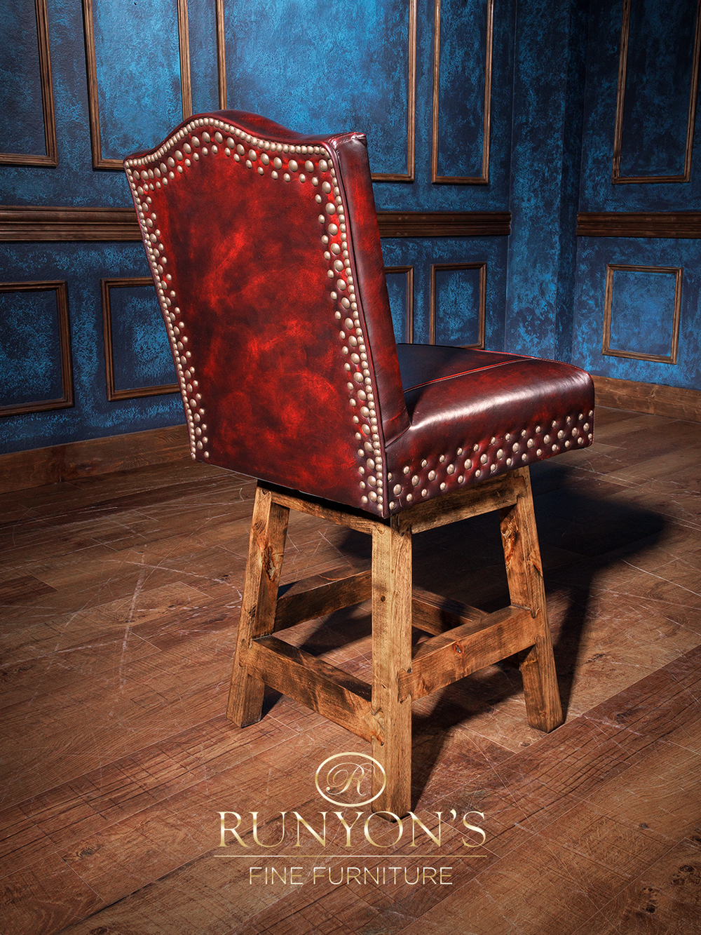 Handmade in Texas, this barstool features sturdily squared hard lines in its base, handcrafted from Knotty Alder for strength and durability. A complete 360-degree ball-bearing swivel mechanism allows for smooth rotation and easy interaction. Built to withstand the wear and tear of everyday use, the comforting feel of the leather and molded seat shape offer a uniquely authentic experience.