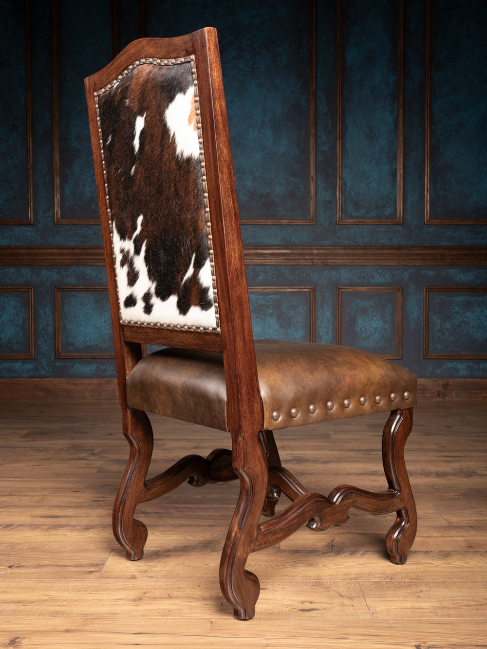 With its hand-carved solid wood frame with a rich finish, this chair ensures comfort and lasting quality for everyday use or special occasions. This leather and cowhide dining chair is an excellent choice for those looking to bring class and elegance to any dining room, living area, office space, or study. The large nailheads along the edges add a striking touch, reinforcing the chair’s durability and western appeal.