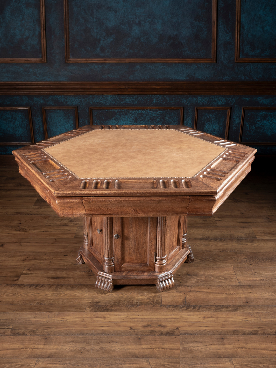 The Grand Saloon is a handcrafted western poker table built for the luxury home game room, man cave, and ranch interior. Carved from solid hardwood with a warm leather playing surface and built-in chip and drink rails, it brings western craftsmanship and artisan detail to any lodge or ranch space. The removable wood top cover keeps the table versatile for any occasion. Individual pull-out storage drawers at every seat and a cabinet storage base make it as functional as it is impressive — a luxury poker table and western game room centerpiece built to outlast every hand dealt at it.