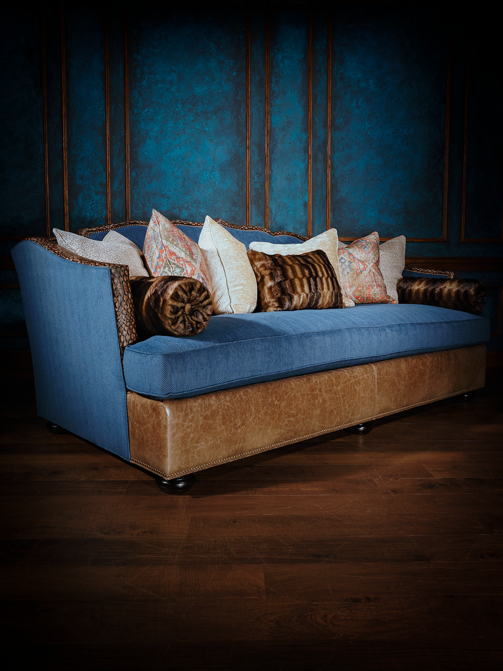 Classy Western Sofa with Blue Fabric, Contrasting Brown Leather, and Rustic Embossed Accents