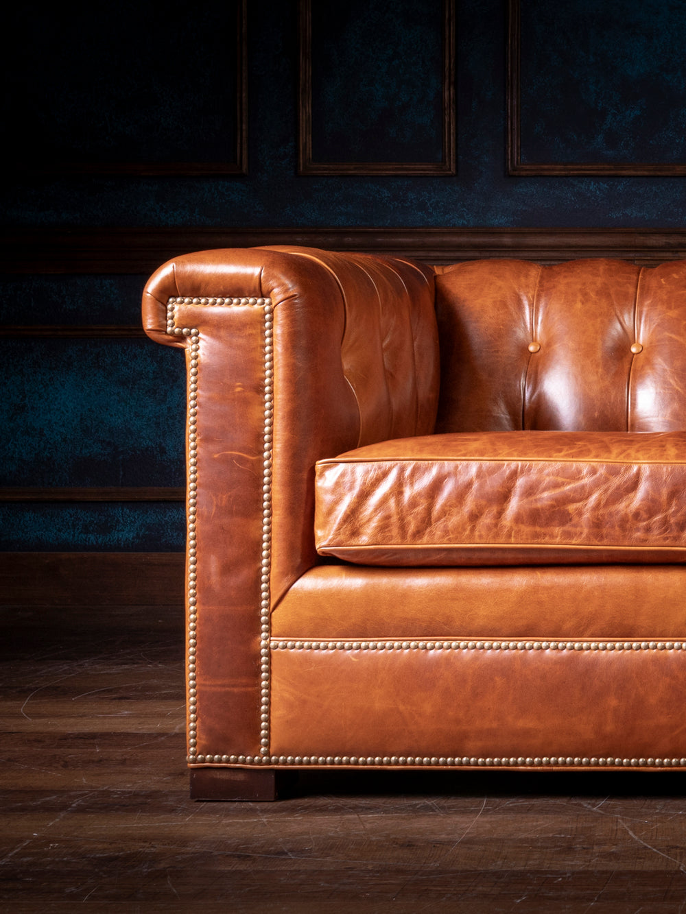 Crafted with timeless attention to detail, this tufted leather sofa is a showcase of true artisan workmanship. Built on a solid wood frame for superior strength and longevity, each piece is handcrafted in the USA by skilled makers who specialize in Western luxury. The hand-tufted backrest and gracefully rolled arms speak to classic design, while the hand-applied nailhead trim adds refined character and depth. Every element—from the precision joinery to the final stitch—is thoughtfully executed to deliver a piece that balances rugged charm with heirloom-quality craftsmanship.