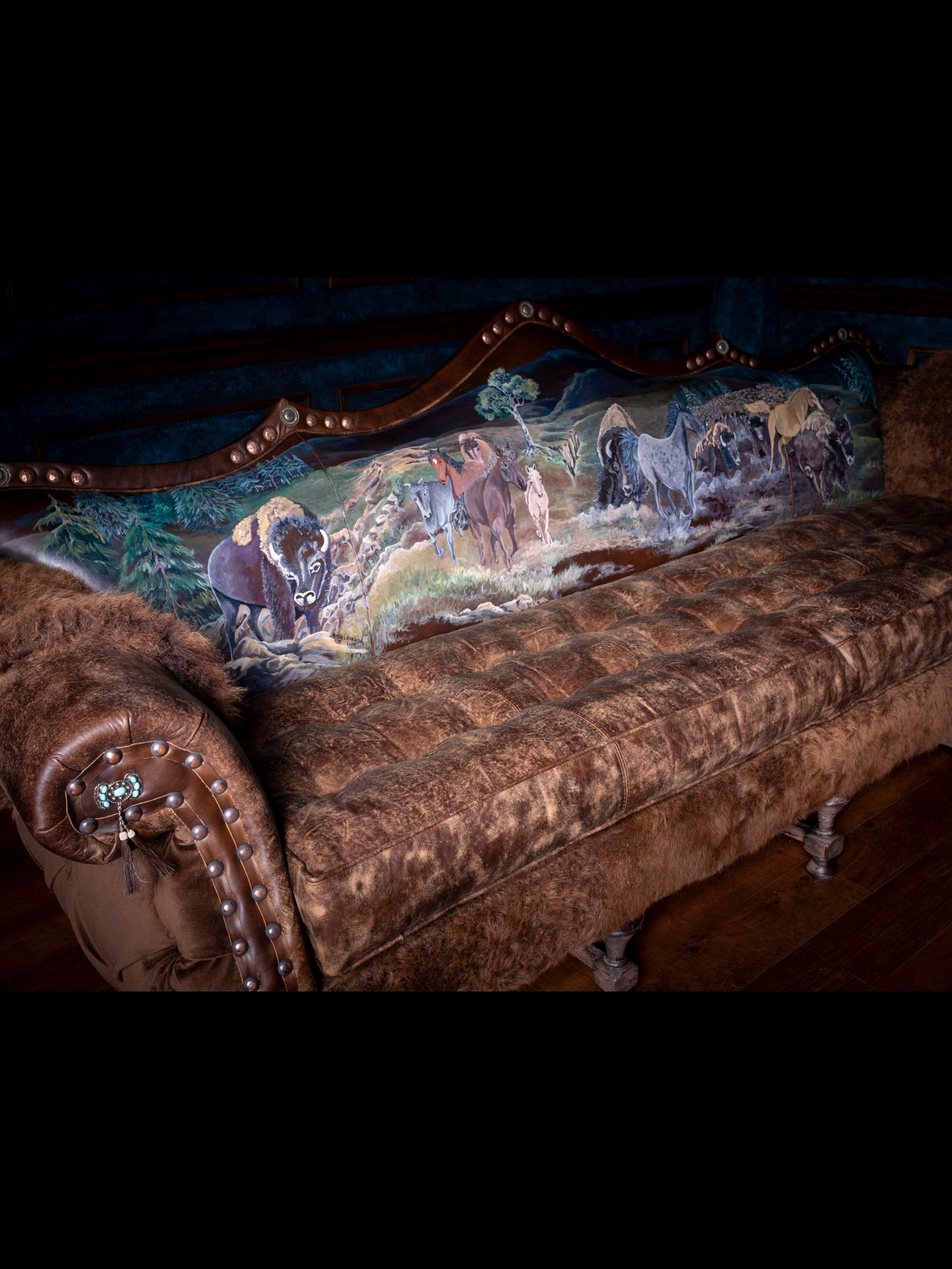 A western-style sofa featuring smooth tan leather cushions, detailed leather trim, and sides and back upholstered with axis deer hide, set in a room with dark blue walls and wooden flooring.