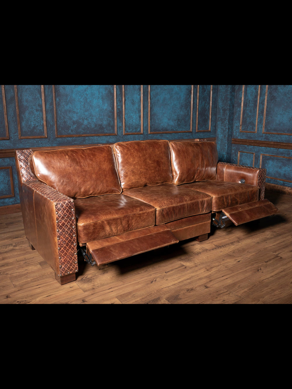 Bison Leather Power Recliner Sofa with footrests extended, demonstrating the dual reclining feature in an opulent dark-wood panel room.
