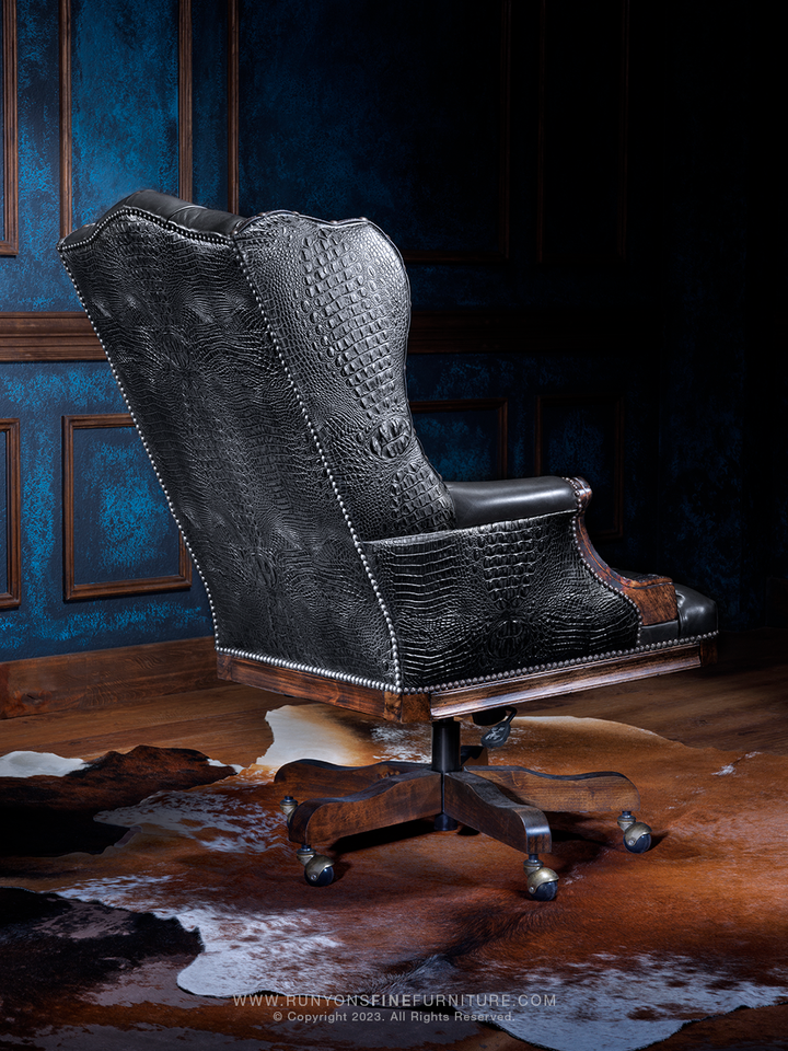 Elevate your workspace with this exceptional blend of western inspiration and modern style, making a bold and unforgettable statement in any office or study. The Midnight Crocodile Leather Desk Chair combines timeless craftsmanship with contemporary functionality, creating the ultimate centerpiece for your heritage home office.