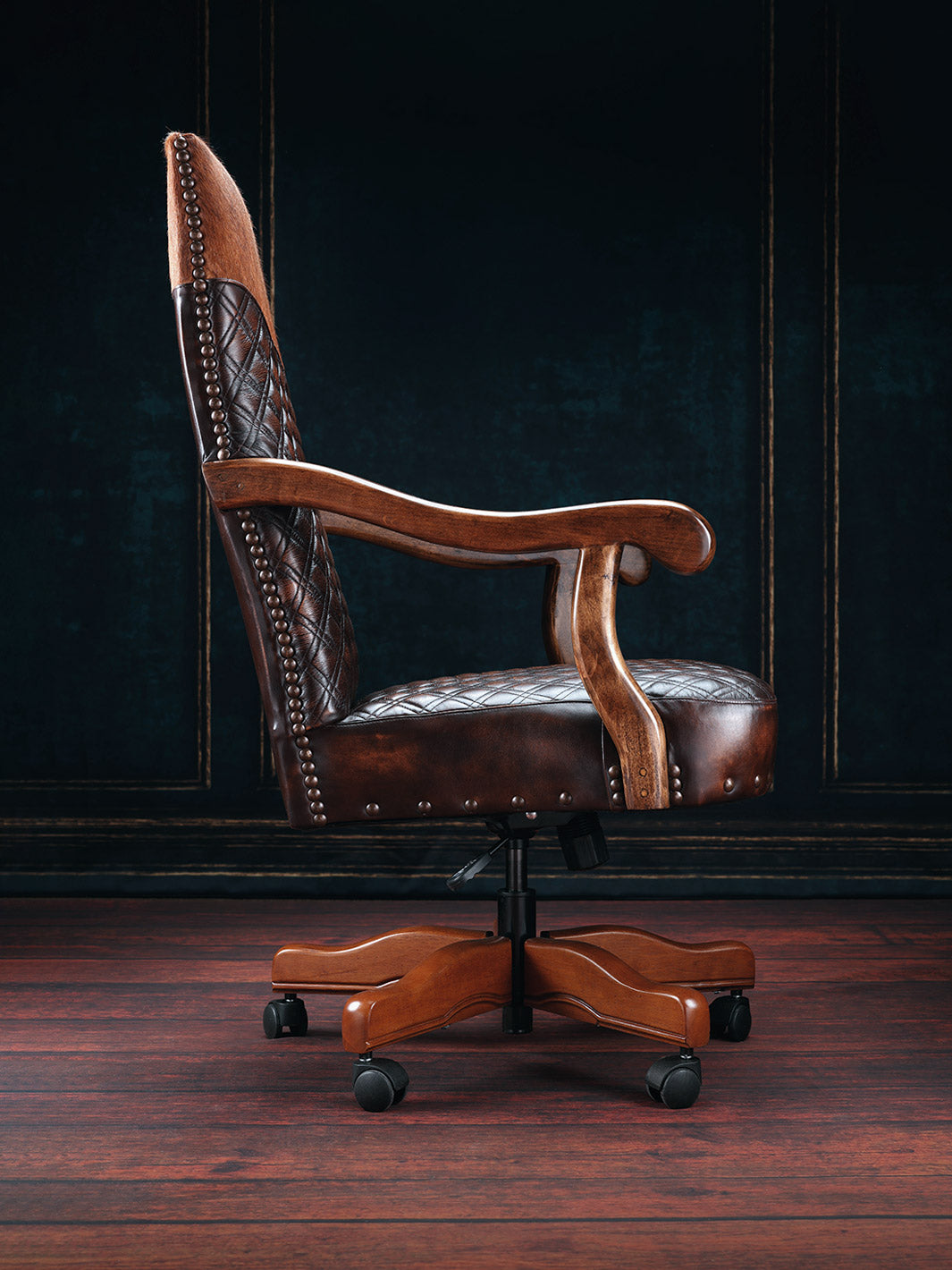 The lower inside back and top of the seat cushion of this executive desk chair are upholstered with hand-antiqued diamond stitch Puglia brown leather, offering a sophisticated and timeless aesthetic. The dark brindle cowhide yoke with natural hair and color adds a rustic charm, while the piece is accented with nailheads for a refined finishing touch.