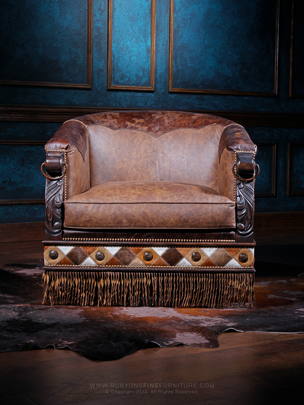 Solid Brown Leather, Ranch Branded Accents, Ornate Wood Carvings, and Leather Fringe Details