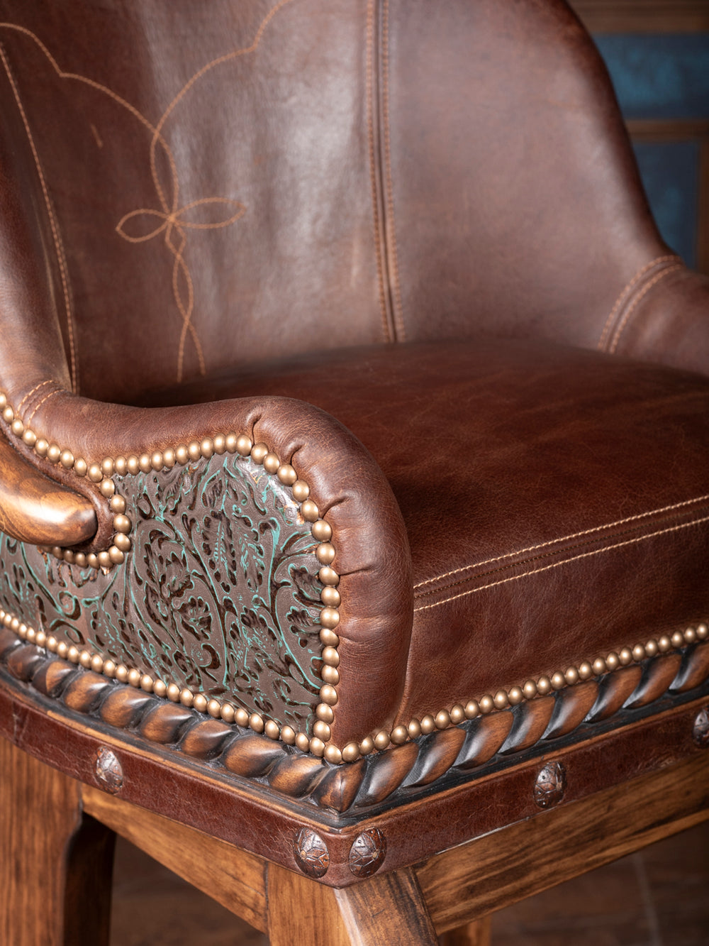 Wrapped in full-grain leather, the stool features a hand-sculpted longhorn design accented with turquoise and bronze floral hand-tooled leather on the outer back and sides. The inside back showcases a western boot stitch design, and a hand-carved rope twist detail frames the seat deck. Antique brass nailheads add a touch of artisanal finesse to enhance the stunning contrast between the materials, while the comfortable deep seat cushion and armrests' gentle curve allow you to mold perfectly into the seat.