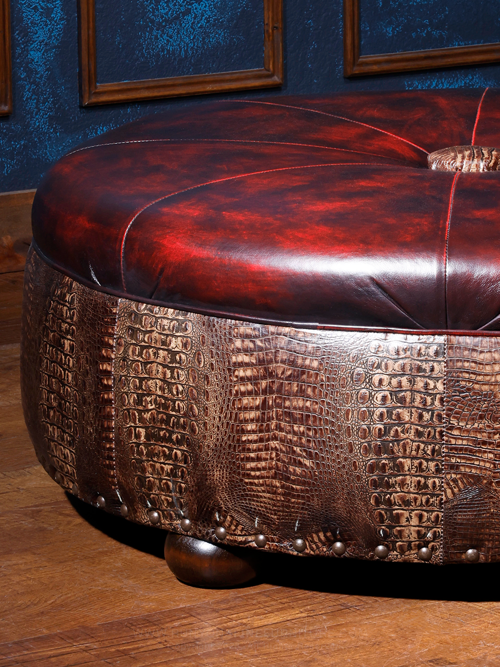 This round Texas-made ottoman is meticulously crafted from burnished hacienda red Italian upholstery and embossed with a beautiful crocodile brown leather. Its sturdy construction and timeless design will make it a standout piece in any room.