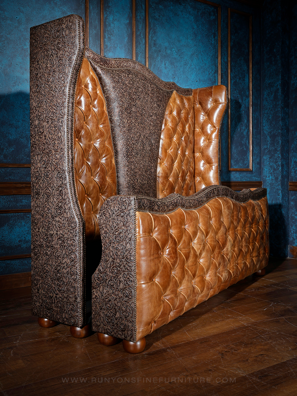 The dramatic high-back headboard and gently curved footboard showcase deep diamond tufting, accented by a hand-applied nailhead trim for added dimension and rustic appeal. Upholstery customization is available in your choice of leather, fabric, or exotic hide combinations, making it easy to personalize this centerpiece to your unique style. Available in both King and Queen sizes.