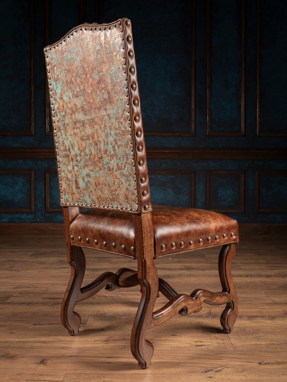 Upholstered in a unique multi-tone leather and deliberate crackle effect that gracefully ages, enhancing its character over time. The distinctive cracking reveals a rich, underlying crust color that adds an exclusive touch to each piece. This chair is further adorned with decorative copper and teal leather accents, providing an additional layer of sophistication. Hand-carved and expertly upholstered, it combines artisanal craftsmanship with the timeless allure of vintage leather, making it a standout addition to any decor.