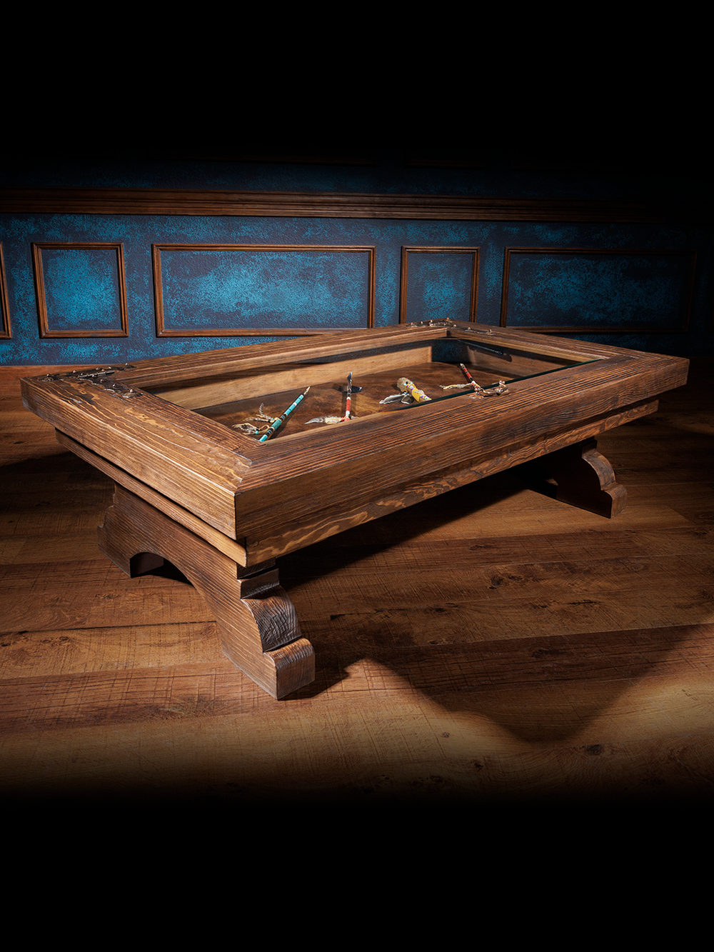 The rectangular display-top coffee table includes a hinged glass lid with strut supports, allowing easy access to the tan, tooled leather-bottomed shadow box beneath. The glass top shows your displayed cherished possessions while keeping them protected. Curved, bracket-style legs support the structure and enhance the western mood of your living room.