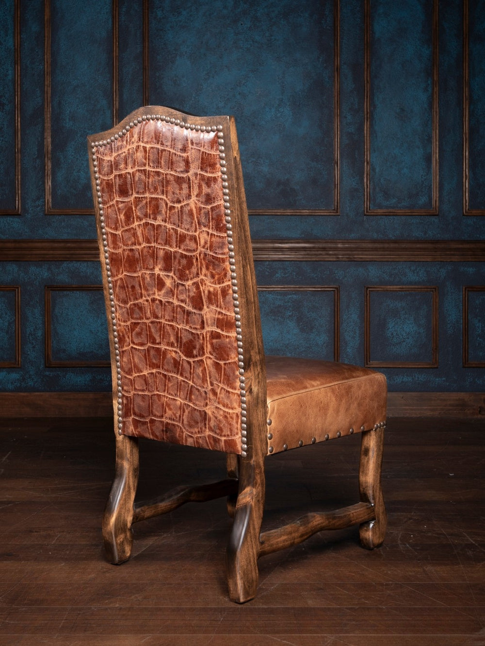 The Jumbo Croc Sycamore Leather Dining Chair is designed to bring class and elegance to any dining room, living room, study, or office, a statement piece that embodies comfort and style. Crafted with a hand-carved solid wood frame, this chair offers durability and timeless appeal. The seat and inside back are upholstered in full-grain leather, while the outside back is adorned with croc-embossed sycamore leather, adding a distinctive touch of western charm.
