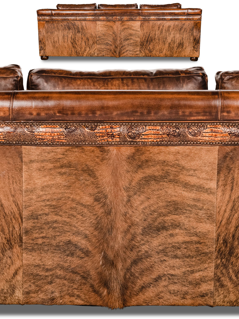 Experience the perfect blend of rugged charm and contemporary design with our Rodeo Architect Quilted Leather Sofa, a custom-designed, one-of-a-kind western leather sofa. This amazing product is crafted with top grain Puglia brown diamond quilted leather, accented with brown brindle cowhide on the sides and Butch Cassidy Savannah embossed leather trim for a truly unique and eye-catching leather sofa that’ll complement your home decor.