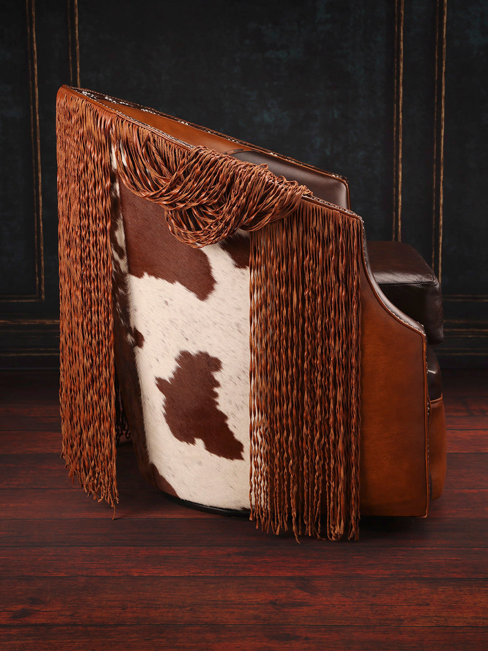 The Rustic Rendezvous Swivel Chair embodies classic luxury with a touch of western flair, showcasing its own unique identity achieved through hand-crafted methods. It features genuine leather with hand-stitched details and nailheads on the trim, ensuring a classic, timeless look. The authentic western-style fringe detailing cascading down the exterior of the chair enhances its charm, while genuine cowhide wraps the barrel-style chair outside back.